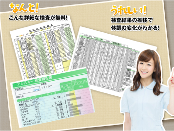 中性脂肪、HDLコレステロール、LDLコレステロール、総蛋白、アルブミン、A/G、総ビリルビン、AST(GOT)、ALT(GPT)γ-GTP、LDH、ALP、コリンエステラーゼ、アミラーゼ、血糖、HbA1c(NGSP)、尿酸、Ca(カルシウム)、P(無機リン)、Na(ナトリウム)、K(カリウム)、C(l クロール)、CPK、赤血球数、ヘモグロビン濃度、ヘマトクリット値、血小板数、白血球数、好中球比、好酸球比、リンパ球比、好塩基球比、単球比、クレアチニン、CRP、血圧、身長、体重