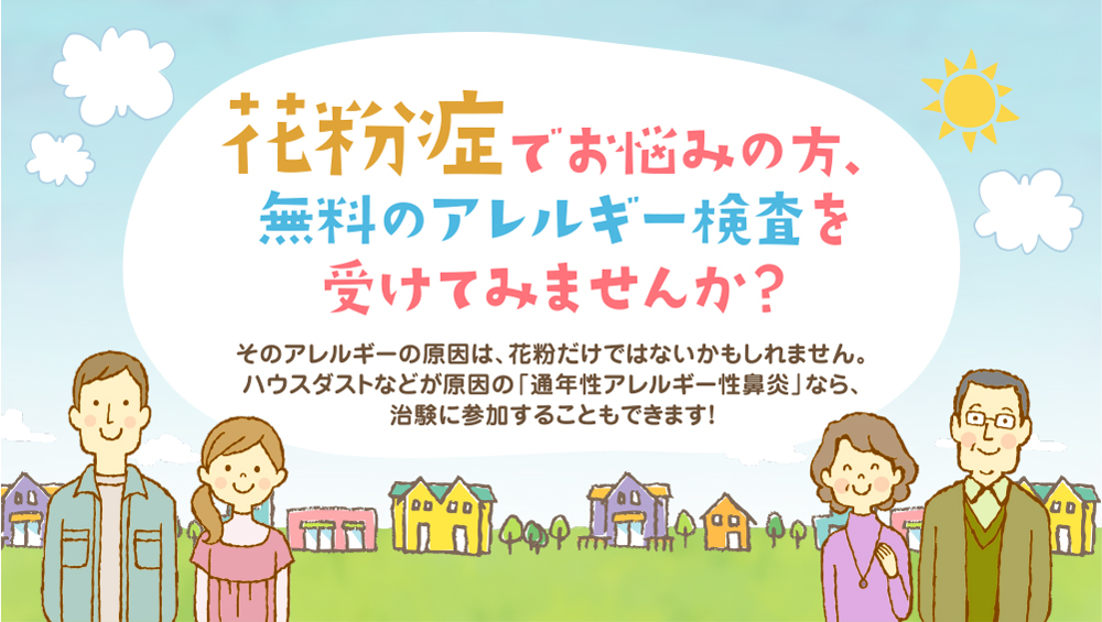 | ご協力いただけない方 | 以下のいずれかに該当する方 ①気管支喘息を合併している方 ②副鼻腔炎、鼻茸、鼻中隔弯曲症などの鼻疾患を合併している方 ③減感作療法や変調療法(ワクチン療法など)で治療中の方 ④狭心症・心筋梗塞などの心疾患、脳卒中などの脳血管障害の既往がある方 ⑤明らかな肝障害・腎障害を有する方 ⑥悪性腫瘍の既往または合併のある方 ⑦他の治験に参加中の方 ⑧妊娠中もしくは治験期間中に妊娠予定のある女性 ※その他条件により、ご参加いただけない場合があります。 |