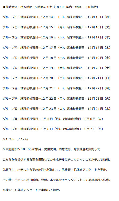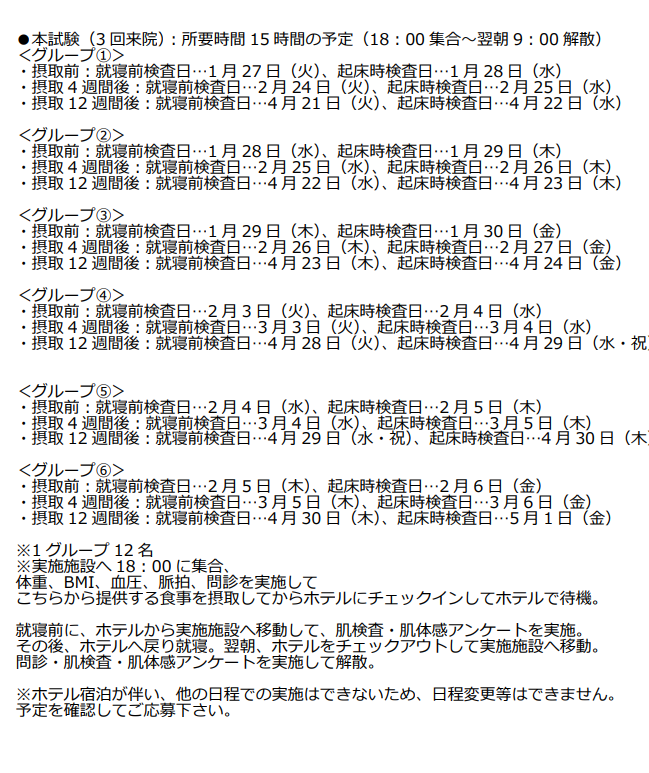 | 説明 | 【本モニターの概要】 肌の乾燥を自覚している20歳~58歳の日本人男女に、試験食品を12週間継続して摂取していただき、起床時や睡眠前後の肌のバリア機能や保湿状態の変化を確認するモニターです。 健診2回、本試験3回の計5回来院(うち4回は宿泊を伴います)していただきます。 【試験スケジュール】 ≪試験期間≫ 11月18日(火) ~ 2026年5月1日(金) ≪来場回数≫ 計5回(通院1回+1泊2日×4回) ≪1回目来場 (健診会①)≫ 11月18日(火) ≪来場時間≫ 集合13:25(試験開始13:45) ≪所要時間≫ 約4時間 ≪内容≫ 健診会説明、同意取得 身長、体重、BMI、血圧、脈拍測定 問診、 採血 選択基準・除外基準のセルフチェック 肌測定 ※選定連絡①:12月6日~12月12日予定 --- 健診会①を通過された方 --- ≪2回目来場 (健診会②)≫ 12月14日(日) ~ 2026年1月7日(水) のうち、 指定された連続2日間 (1泊宿泊) 検診会②のスケジュール詳細はこちら ≪来場時間≫ 18:00集合 ~ 翌朝9:00解散 ≪所要時間≫ 約15時間 ≪内容≫ 試験説明、同意取得、背景調査 肌検査、 肌体感アンケート (就寝前・起床後の計2回) ※選定連絡②:1月23日までに連絡予定 --- 健診会②を通過された方 (本試験) --- ≪3回目~5回目来場 (本試験 計3回)≫ 2026年1月27日(火) ~ 5月1日(金) のうち、 指定された各連続2日間 (各回1泊宿泊、計3回宿泊) 本試験のスケジュール詳細はこちら (摂取前、摂取4週間後、摂取12週間後に実施) ≪来場時間≫ 各回18:00集合 ~ 翌朝9:00解散 ≪所要時間≫ 各回約15時間 ≪内容 (各回共通)≫ [就寝前] 体重、BMI、血圧、脈拍測定、問診 肌検査、肌体感アンケート [起床時] 問診、肌検査、肌アンケート ※健診会②および本試験の3回(計4回)は宿泊を伴います。 ※全日程、日程変更はできません。 【協力費】 ログインしていただきますと協力費の詳細をご確認いただけます。 【募集定員】 募集定員:22名 参加メンバー:18名 (男性9名・女性9名) 予備メンバー:4名 予備メンバーは、来院後、試験説明を受けて頂き、本予約の方の検診が終わるまで最長約2時間クリニックでお待ち頂きます。 参加が決まりましたら、同意取得及び背景調査に回答して参加して頂きます。 当日の入れ替わりなく終了の場合も協力費のお支払いはございます。 ※スクリーニング検査の結果次第で、本試験に進みます。 【実施場所】 東京都中央区 最寄り駅 東京メトロ 三越前駅 (徒歩約3分) JR 新日本橋駅 (徒歩約3分) JR 神田駅 (徒歩約5分) ※場所の詳細は、参加確定後にご案内致します。 ホテル 実施施設周辺(徒歩圏内) ※場所の詳細は、参加確定後にご案内致します。 |